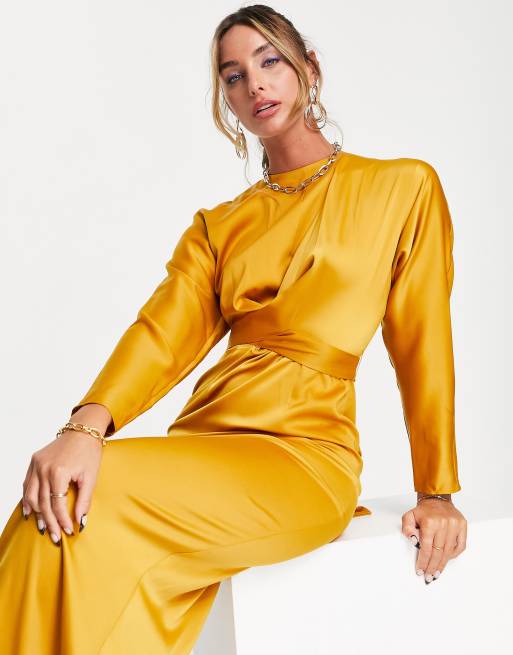 ASOS DESIGN Robe longue en satin manches chauve souris et taille crois e Moutarde Very well made.