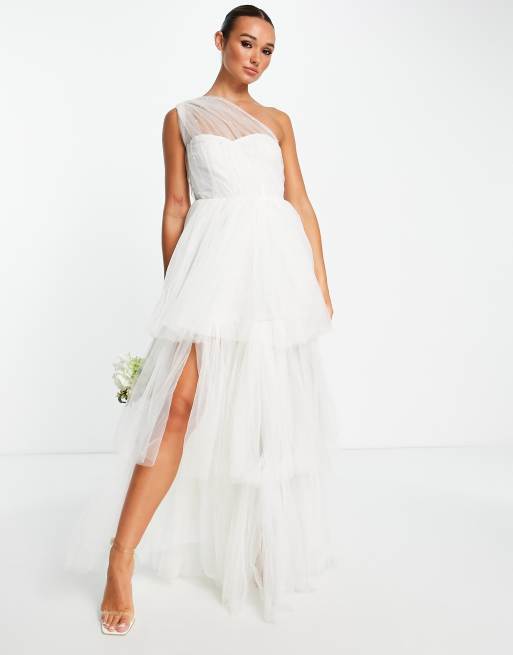Petite robe de mari e en tulle asym trique bustier droit conomique Very well made.