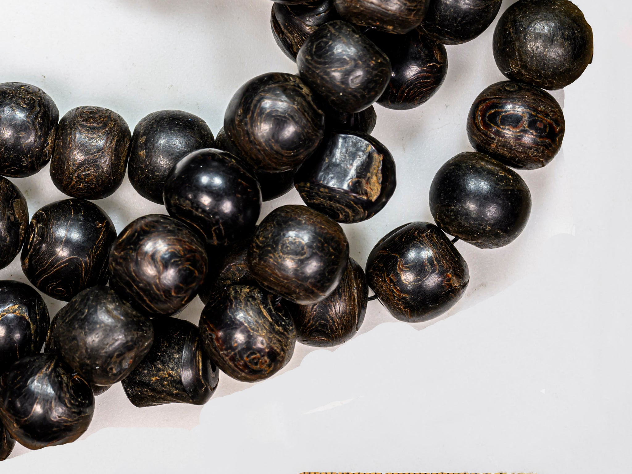 A Long Strand of Large Antique Black Coral Beads from the Red Sea Y24 0275 Very well made.