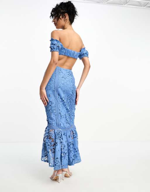ASOS DESIGN Robe longue Bardot en dentelle d coupes et ourlet volant Bleu roi Very well made.