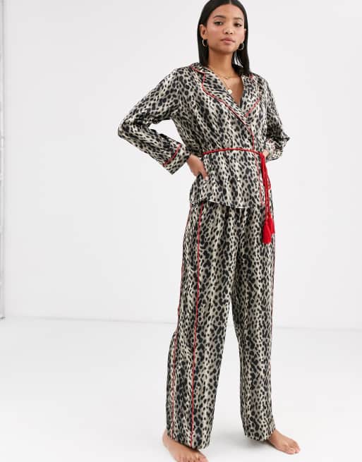 Topshop Tall satin abstract print piped shirt and trouser pyjama set in chocolate Very well made.