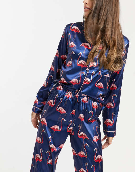 Flamingo Print Satin Pajama Set Comfortable Long Sleeve Button Up Top Elastic Waist Pants Women s Sleepwear Loungewear Very well made.