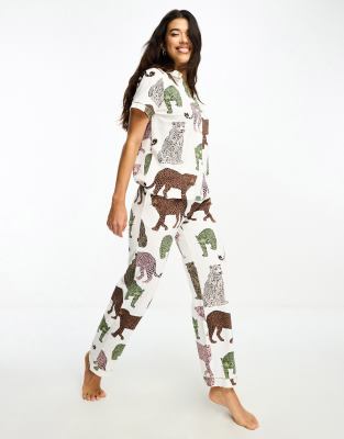 Chelsea Peers Curve cotton tonal leopard print button short sleeve top and pants pajama set in off white Very well made.