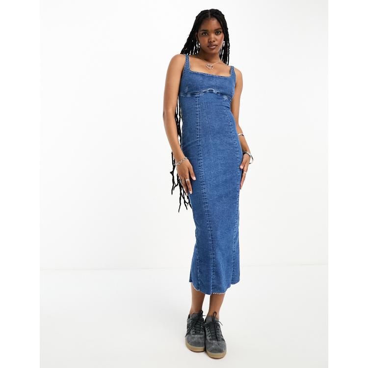 Bershka scoop neck denim bodycon midi dress in mid blue ASOS Very well made.