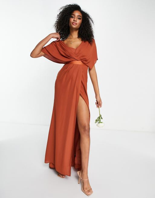 ASOS DESIGN Robe longue de demoiselle d honneur manches bouffantes d coration de satin et jupe portefeuille Very well made.