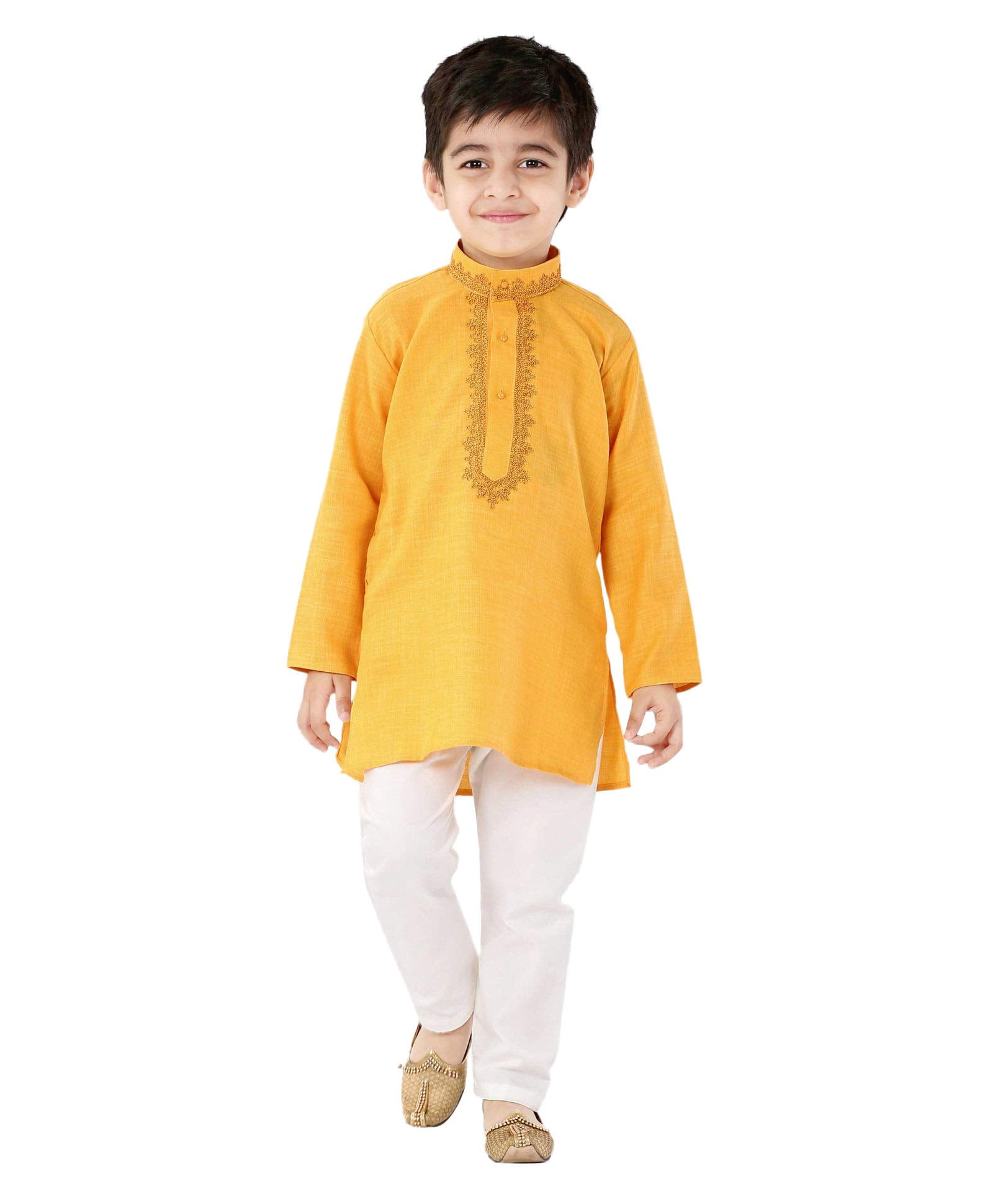 Cotton Festive Boys Kurta Pyjama in Yellow with Printed work Very well made.