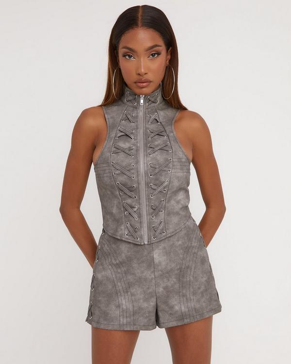 High Neck Zip Front Lace Up Detail Racer Top In Washed Grey Faux Leather Very well made.