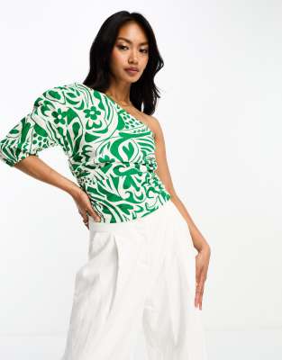 ASOS DESIGN one shoulder top with ruched side in green cream floral print Very well made.