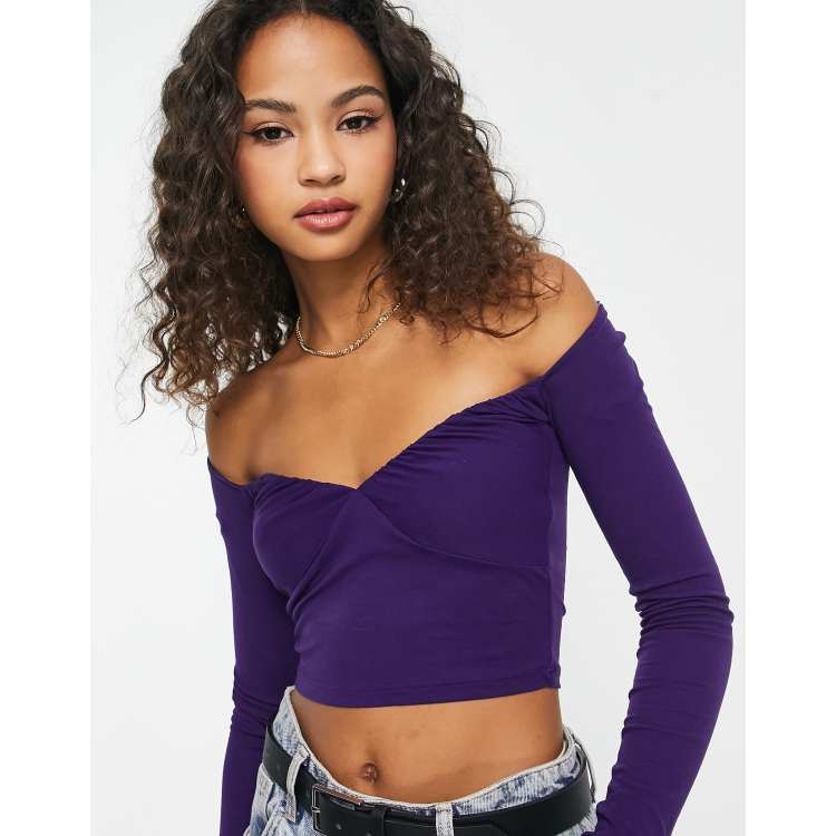 Purple Off Shoulder Wrap Around Tie Ruched Bust Puff Sleeve Crop Top Sz L Jrs Very well made.