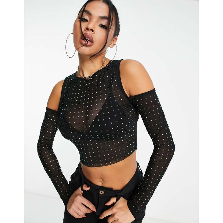 ASOS DESIGN cold shoulder top in black with turquoise crystal stud hotfix Very well made.