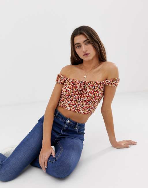 Pull Bear shirred off shoulder top in floral print Very well made.