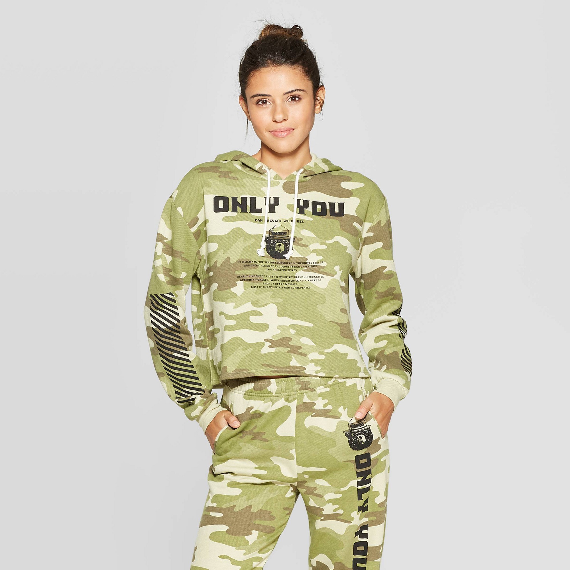 Women s Smokey Bear Only You Camo Print Long Sleeve Cropped Hoodie Very well made.