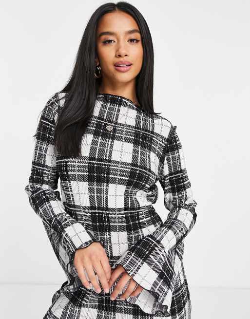 ASOS DESIGN Petite plisse mini dress with long flare sleeves in black and white plaid print ASOS Very well made.