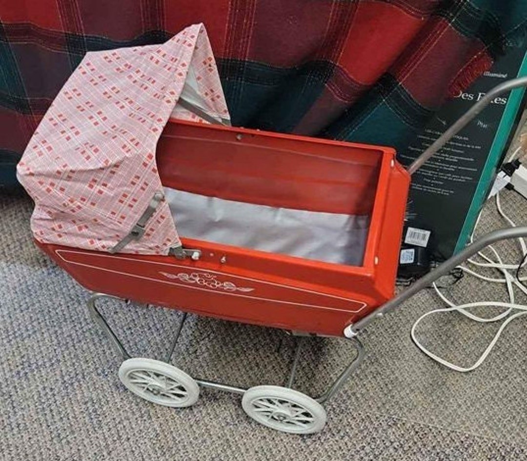 Vintage 1960s THISTLE Doll Toy Carriage Pram Red and White Vinyl Fold Down Top Metal Base With Springs 1960s Thistle Brand Made in Canada. Etsy Canada Very well made.