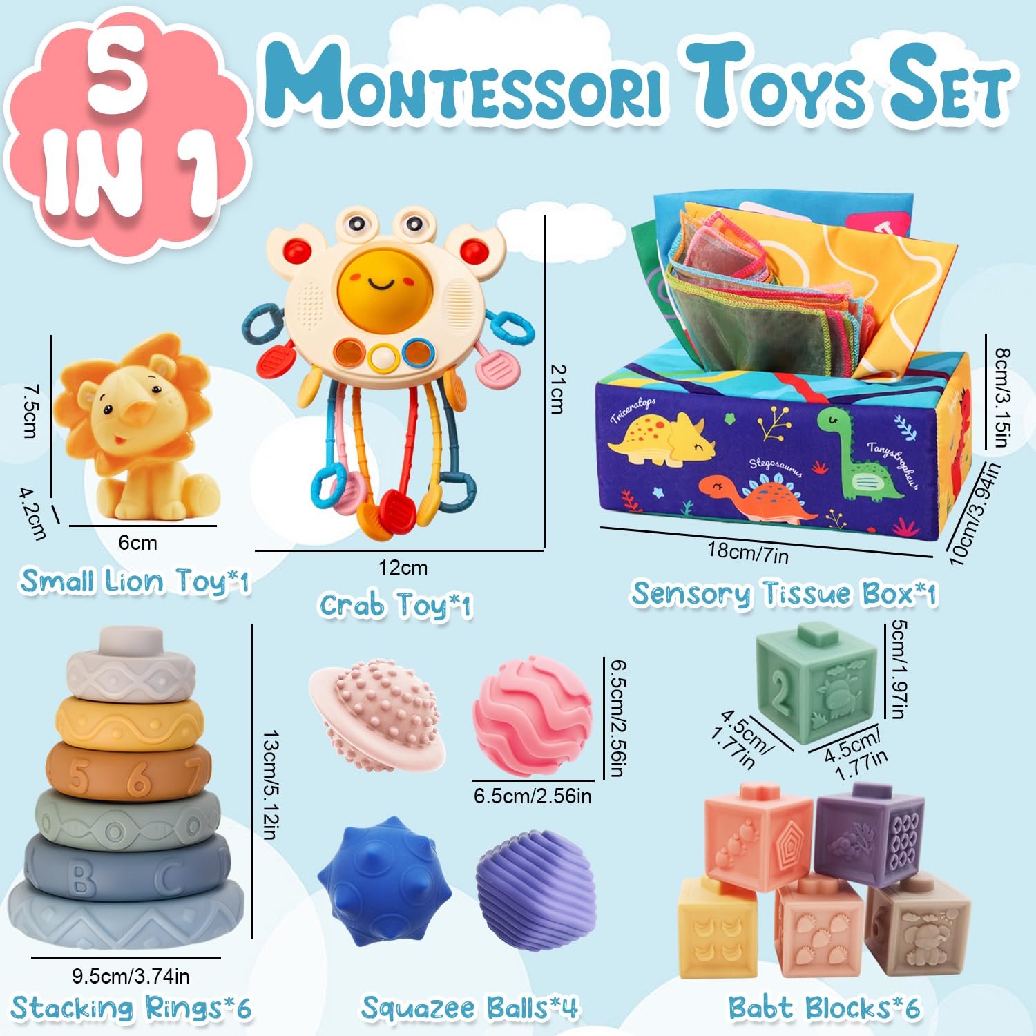 Montessori Baby Toys 6 to 12 Months 5 in 1 Montessori Toys 6 12 18 M Baby Stacking Toys Baby Tissue Box Toys Pull String Activity Toys Baby Toy Very well made.