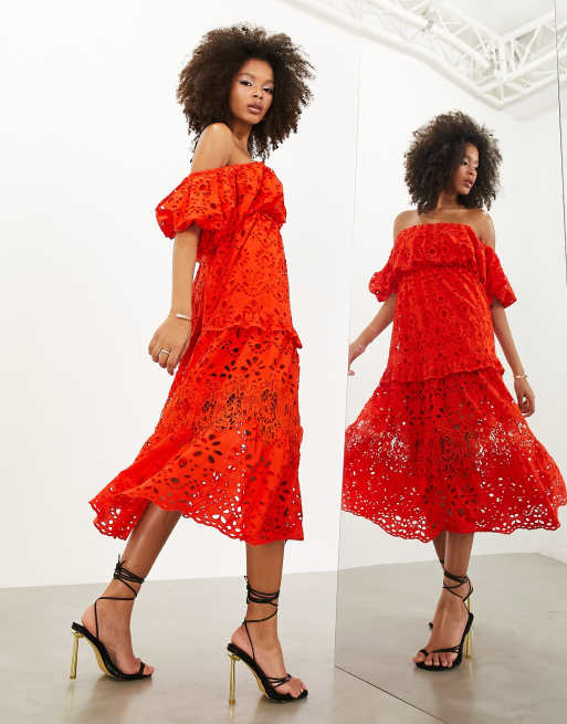 ASOS EDITION Robe mi longue bouffante en broderie anglaise a epaules denudees volants Rouge tomate Very well made.