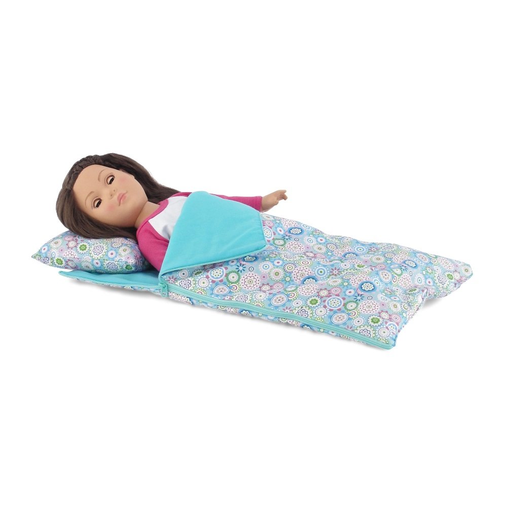 18 Inch Doll Accessories Reversible Multicolored Geometric Flower Print Sleeping Bag Set with Pillow and Drawstring Storage Bag Fits American Girl Very well made.