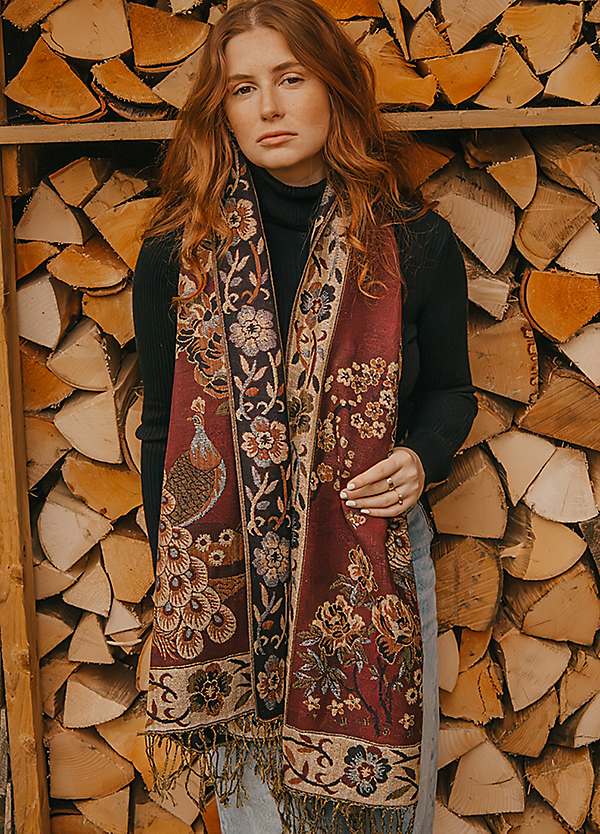 Burgundy Gold Peacock Floral Tassel Luxe Pashmina by Xander Kostroma Look Again Very well made.