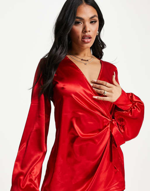 Femme Luxe drape wrap satin blouse in red Very well made.